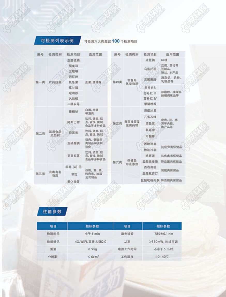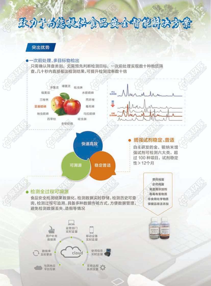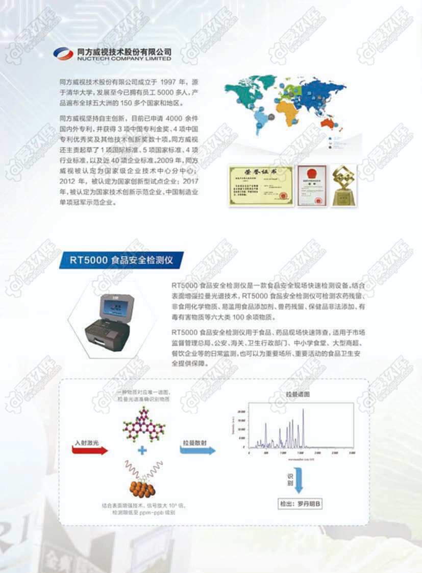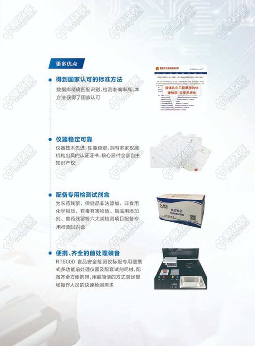 RT5000 食品安全检测仪是一款食品安全现场快速检测设备。结合表面增强拉曼光谱技术,RT5000 食品安全检测仪可检测农药残流留、非食用化学物质、易滥用食品添加剂、兽药残留、保健品非法添加、有毒有害物质等六大类 100 余项物质。 RT5000 食品安全检测仪用于食品、药品现场快速筛查,适用于市场监督管理总局、公安、海关、卫生行政部门、中小学食堂、大型商超餐饮企业等的日常监测,也可以为重要场所、重要活动的食品卫生安全提供保障。